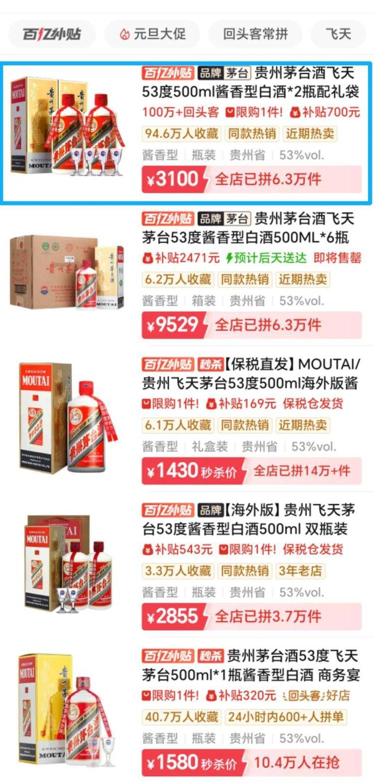 像老张这样面临出货压力的商户不在少数。与线下渠道的价格波动相比,网络平台的价格相对稳定。月初,拼多多曾以“1399元/瓶”的补贴价引发关注,但12月16日记者在该平台已搜不到此链接,其“百亿补贴”价为3100元/2瓶(折合1550元/瓶)。