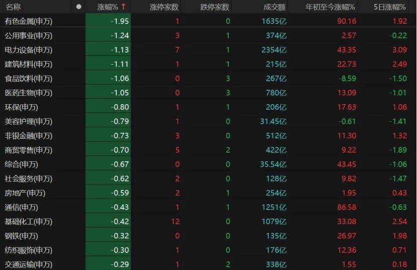 有色金属、公用事业、电力设备、建筑材料、食品饮料、医药生物跌幅均超过1%。