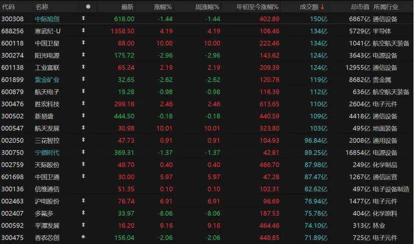 个股跌多涨少,3332只个股收跌,跌停股25只;1995只个股收涨,涨停股87只。今日10只个股成交额超过100亿元,中际旭创收跌1.44%报618元/股,阳光电源跌近3%收报175.72元/股,紫金矿业收跌2.62%报32.65元/股,新易盛微跌。工业富联反弹2.19%报65.24元/股,胜宏科技涨幅超过2%,寒武纪-U收涨4.19%报1358.5元/股。