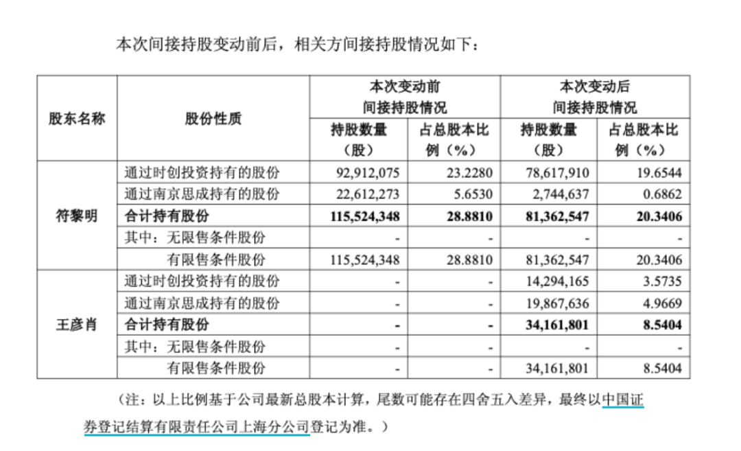 本次间接持股变动前,符黎明未直接持有公司股份,持有时创投资65.00%的股权和南京思成16.48%的财产份额,合计间接持有1.16亿股公司股份,约占公司总股本的28.88%。
