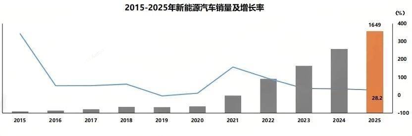中汽协数据显示,2025年,我国新能源汽车产销分别完成1662.6万辆和1649万辆,同比分别增长29%和28.2%,新能源汽车新车销量达到汽车新车总销量的47.9%,较去年同期提高7个百分点。