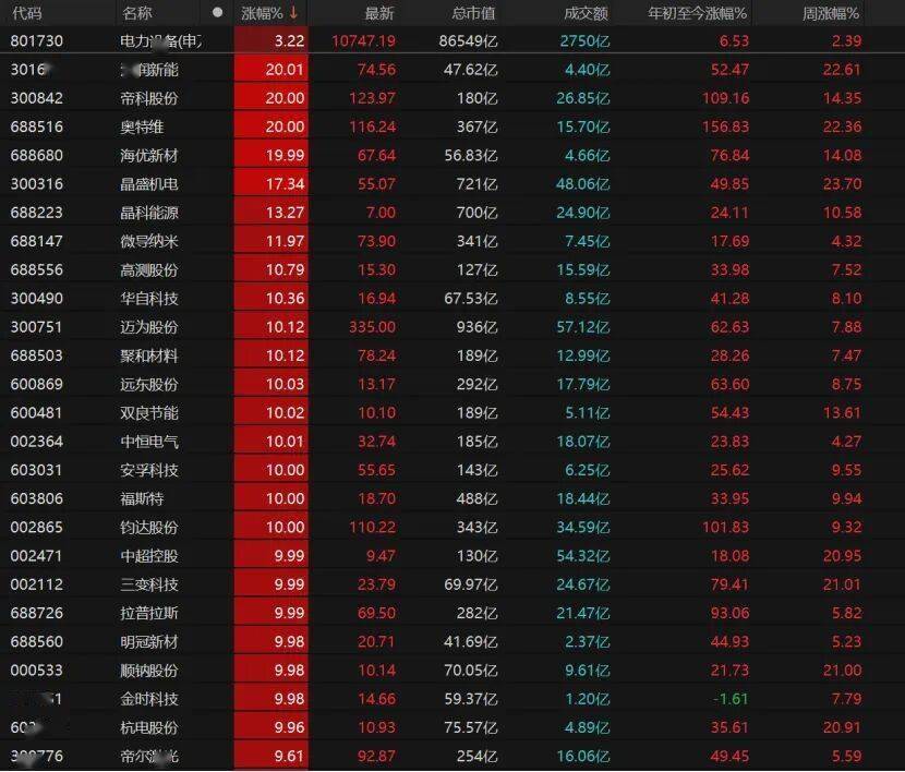 电力设备板块掀起涨停潮,16只个股涨停,泽润新能、帝科股份、奥特维、海优新材“20cm”涨停。