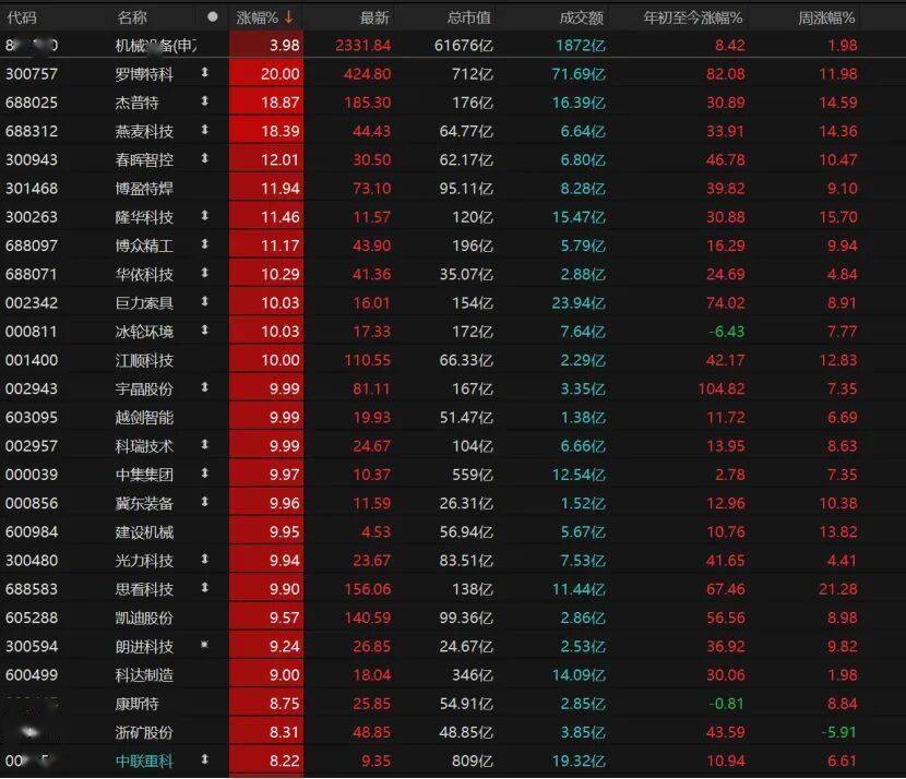 机械设备板块表现抢眼,11只相关个股涨停,其中罗博特科“20cm”涨停,杰普特、燕麦科技、春晖智控均大涨。巨力索具、冰轮环境、江顺科技等股票也涨停。