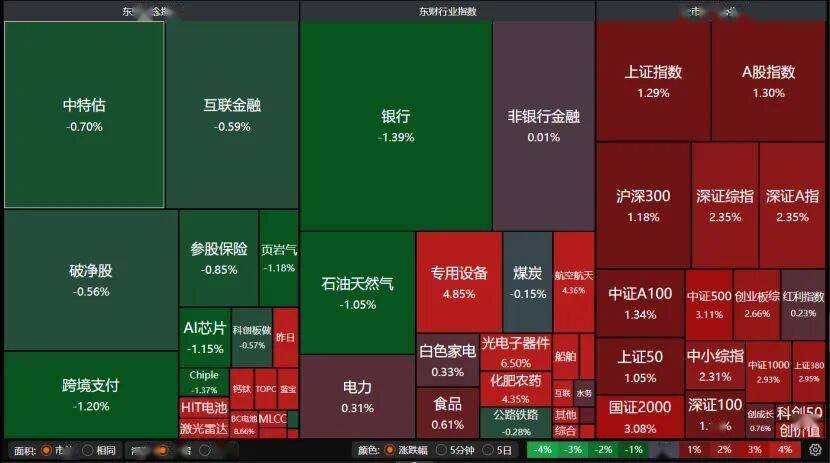 盘面上,科技股和资源股重返主场,专用设备、航空航天、光电子器件、化肥农药、HIT电池均大涨。但中特估、银行、石油天然气、AI芯片表现不佳。
