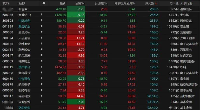 今日市场赚钱效应较好,共计4856只个股收红,83只涨停;532只收跌,跌停股22只。天孚通信收涨13.21%报270元/股,信维通信收涨13.12%报89.47元/股,紫金矿业涨逾6%报38.81元/股。但寒武纪-U跌逾9%报1128元/股,新易盛跌逾2%。