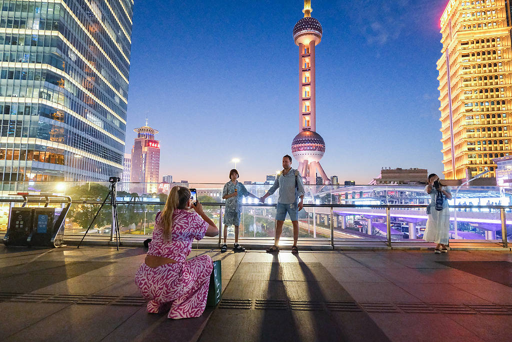 国内外游客前往东方明珠塔打卡拍照。视觉中国 资料图