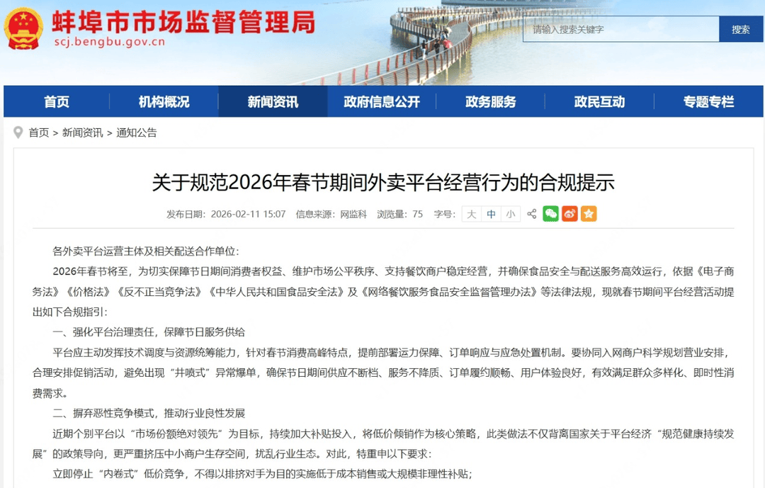 2月6日,信阳市市场监督管理局发布春节外卖提醒告诫书,其中“外卖内卷”“价格战”等突出问题在告诫书中被重点提及。比如告诫书指出,持续加大补贴投入、将低价倾销作为核心策略等做法,不仅背离国家关于平台经济“规范健康持续发展”的政策导向,更严重挤压中小商户生存空间,扰乱行业生态。