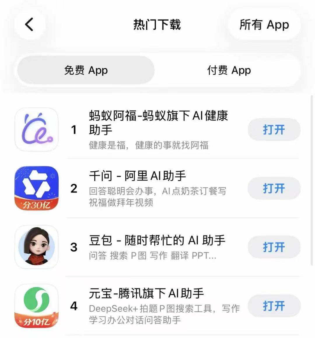成功引爆用户热情的是腾讯。2月1日,腾讯旗下元宝App开启「春节分10亿现金」活动。活动初期,微信聊天群的「不限流」待遇,引发元宝App全民关注和下载浪潮,即便其后相关导流链接被微信官方「屏蔽」处置,但直到2月15日,元宝App依然位列App Store下载排行榜前四,仅次于阿里系两款更大手笔的AI应用,以及字节跳动的豆包App。