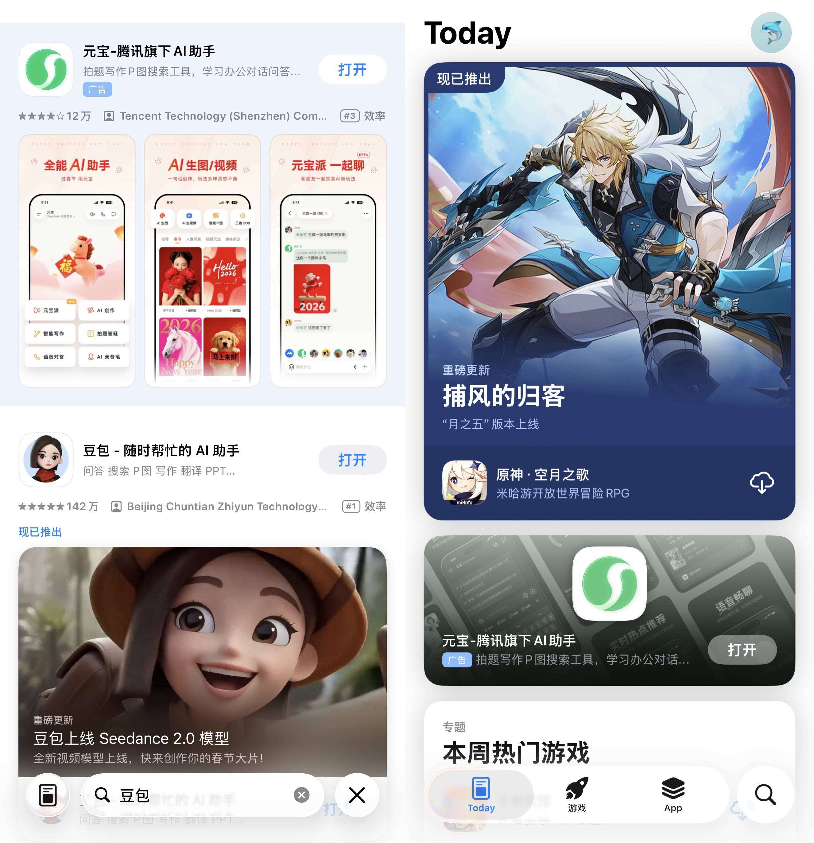 目前在App Store搜索页(例如搜索「豆包」时)、Today页,均有机会看到元宝的投流广告。