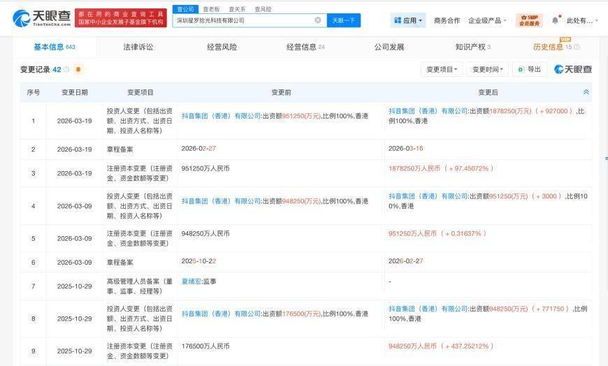 天眼查工商信息显示,近日,深圳星罗拾光科技有限公司发生工商变更,注册资本由约95.1亿人民币增至约187.8亿人民币,增幅约97%。