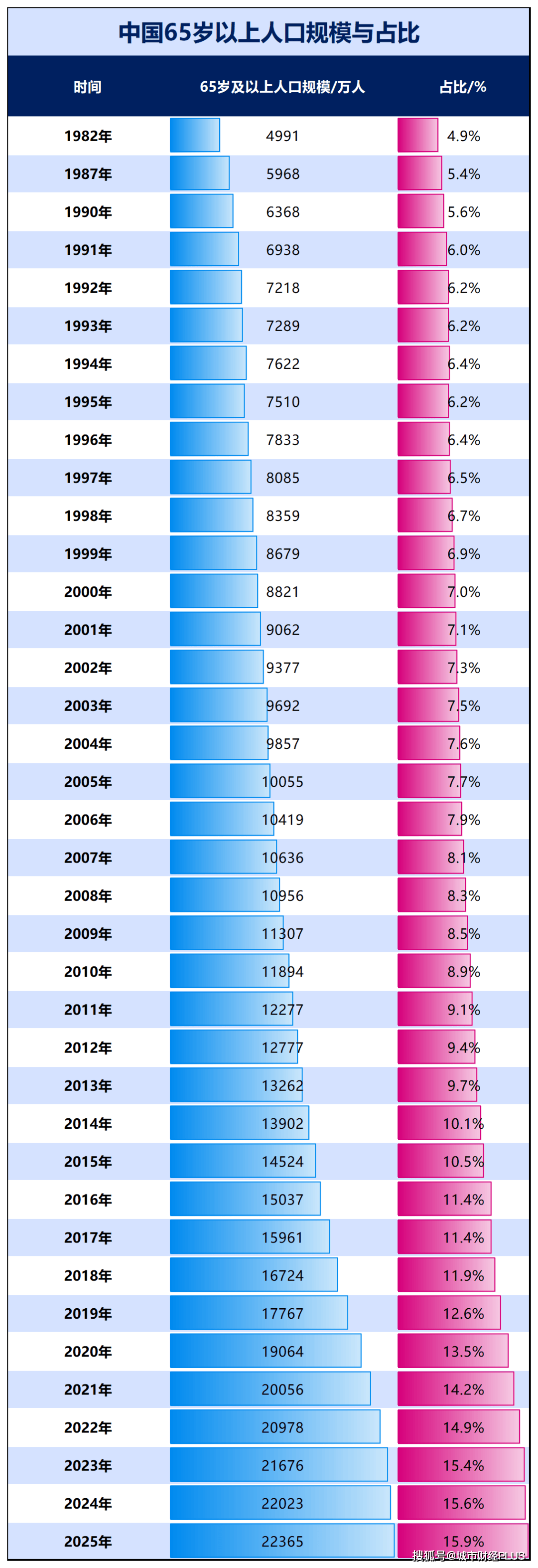 2025年这一规模扩大至22365万人,是1982年的4.48倍。占比扩大至15.9%。