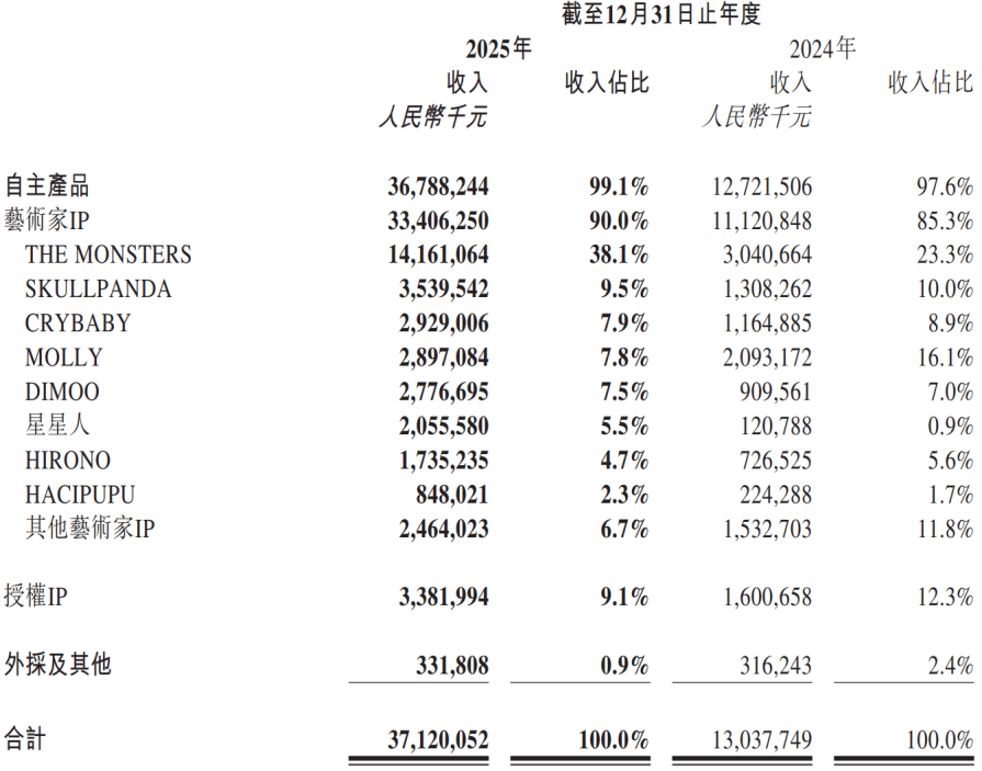 但随着LABUBU持续火热,“IP依赖症”质疑再度归来。2025年,LABUBU所属的THE MONSTERS系列IP收入占比达到38.1%,已接近MOLLY高峰时期的水平。
