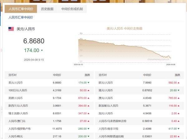 中国外汇交易中心公布,4月8日,人民币兑美元中间价报6.8680,继续上调174.00点。