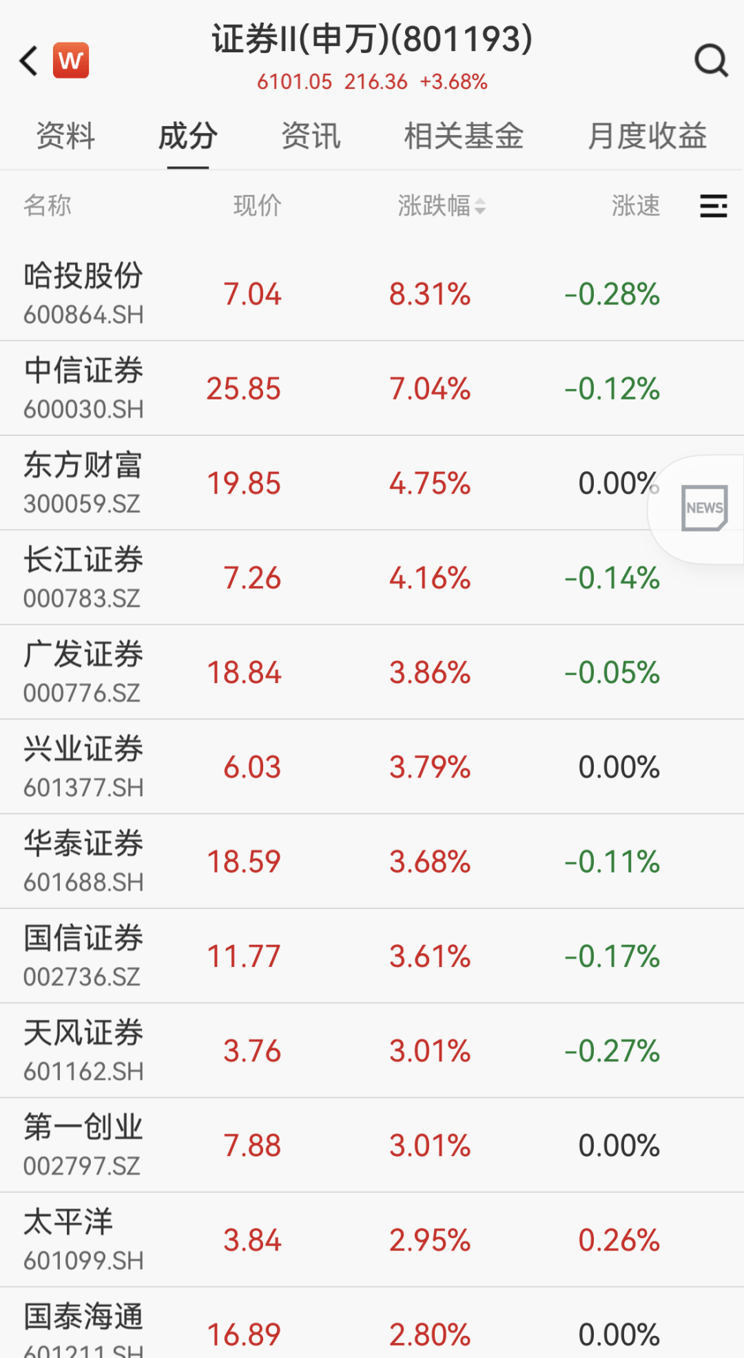 早盘,券商股集体拉升,证券行业指数上涨3.68%,50.94亿元主力资金净流入券商板块;其中,哈投股份上涨8.31%,中信证券上涨7.04%,东方财富、长江证券均上涨超4%。