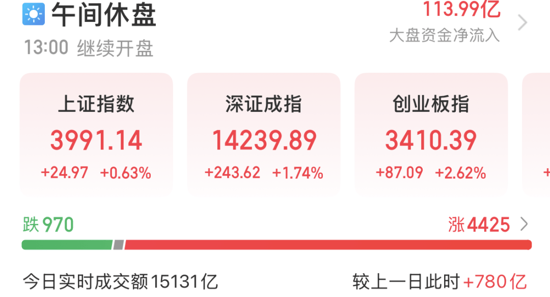 今日(4月10日)早盘,A股市场主要股指集体上行,沪指盘中站上4000点,最高上涨1.13%,午间休市上涨0.63%;深证成指涨1.74%,创业板指大涨2.62%,盘中创下2022年以来新高。