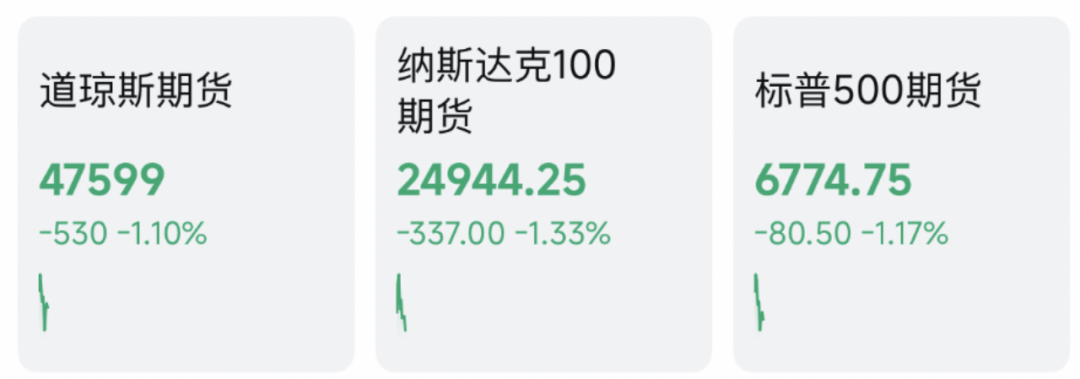 北京时间4月13日清晨,美股三大股指期货全线跳水,截至06:40,道指期货跌1.11%,纳斯达克100指数期货跌1.33%,标普500指数期货跌1.17%。