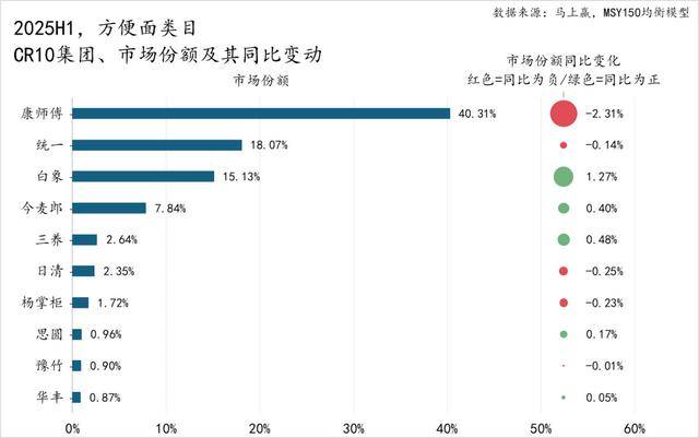 到了2025年下半年,康师傅、统一的市场份额继续增加,而今麦郎的占比,却仍旧处于下滑趋势。
