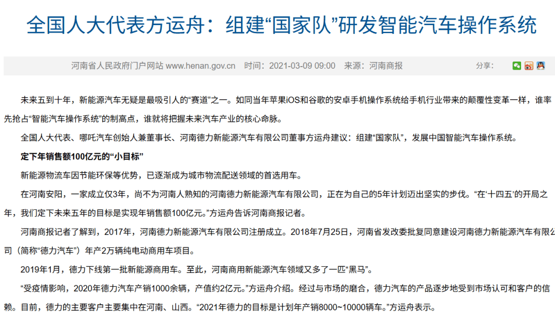 方运舟同样以其实控的上海哲奥实业有限公司,参与投资了德力新能源汽车有限公司。本人在2022年8月之前,方运舟更是该公司”的董事。同时也正在那时候,根据公开报道显示,代表德力新能源汽车有限公司,出现在河南当地公开场合中的正是方运舟。