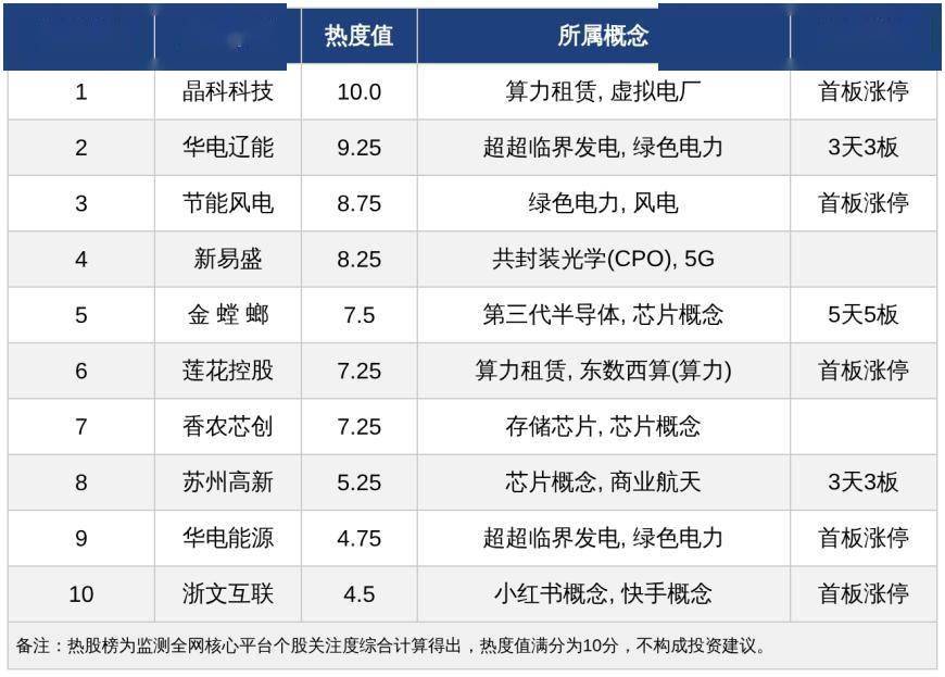 今日,A股十大人气热股如下:晶科科技、华电辽能、节能风电、新易盛、金螳螂、莲花控股、香农芯创、苏州高新、华电能源、浙文互联。