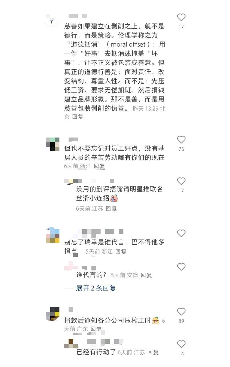 目前,瑞星相关贴文下充斥着网友愤怒的质疑,大家认为此次捐款1000万元“四舍五入相当于员工捐的”。