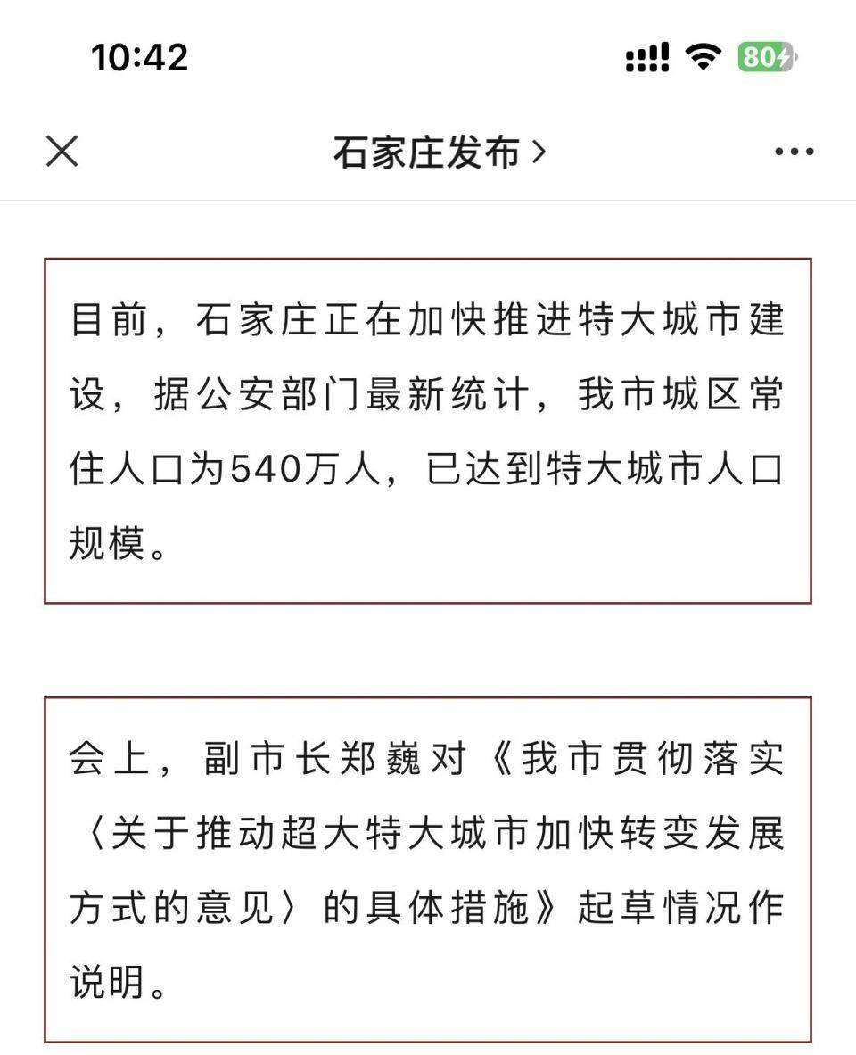 而石家庄则在2024年9月官宣,城区人口540万人,已达到特大城市标准。