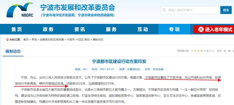 2、宁波市发改委2021年发布的《宁波都市区建设行动方案》提到,宁波都市区囊括宁波市域、舟山市域、台州市域,延伸至绍兴新昌县、嵊州市等周边区域。