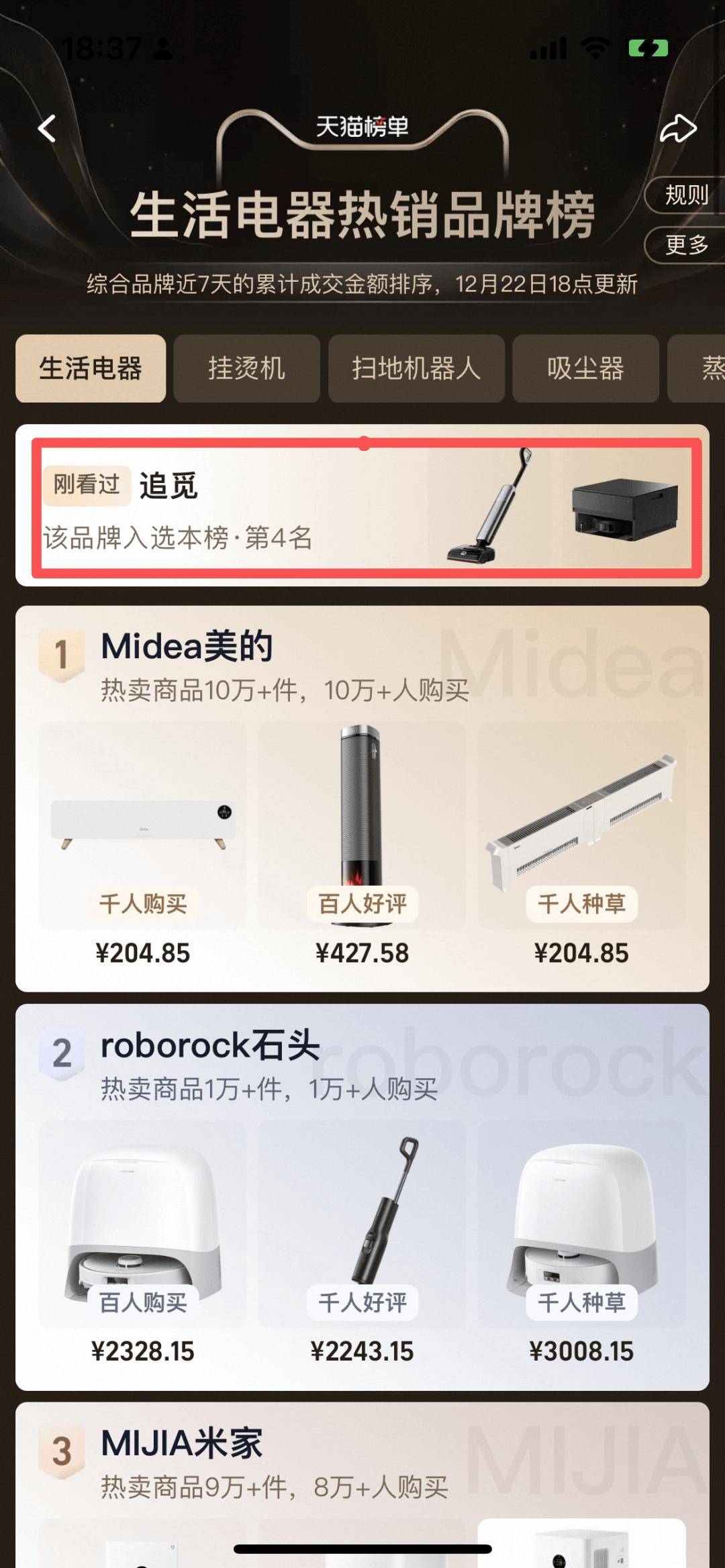 在天猫最新的生活电器成交额排行榜看,追觅仅次于美的、石头和米家。