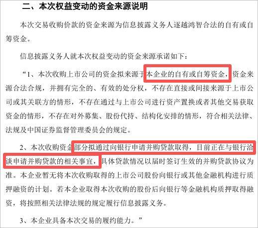 公告称,收购资金来自于逐越鸿智的自有或自筹资金,部分拟通过银行借款获得,并与银行商谈并购贷款事项。