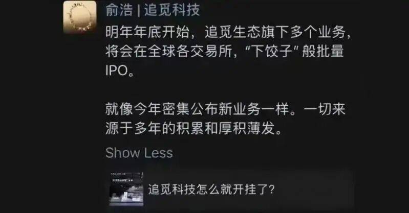 “明年年底开始,追觅生态旗下多个业务将会在全球各地交易所,‘下饺子’般批量IPO。”