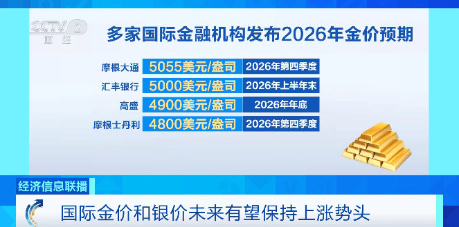 展望后市,市场押注美联储明年将继续实施宽松货币政策,加之美元走软、全球央行购金热潮持续等因素,多家国际金融机构预计,2026年国际金价有望冲击每盎司5000美元整数关口。此外,未来一段时间,供需失衡与美国市场囤积现货等因素可能会推动白银价格继续走高。