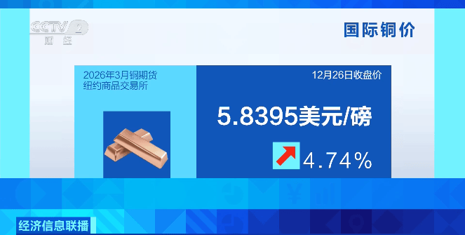 此外,铜被誉为“经济晴雨表”,其价格波动往往预示着宏观经济的变化。因担忧全球铜市场即将面临供应短缺,纽商所期铜主力合约价格26日上涨超4%,进一步巩固了铜价的年度涨幅。一些投资者押注2026年全球铜供应将趋紧。