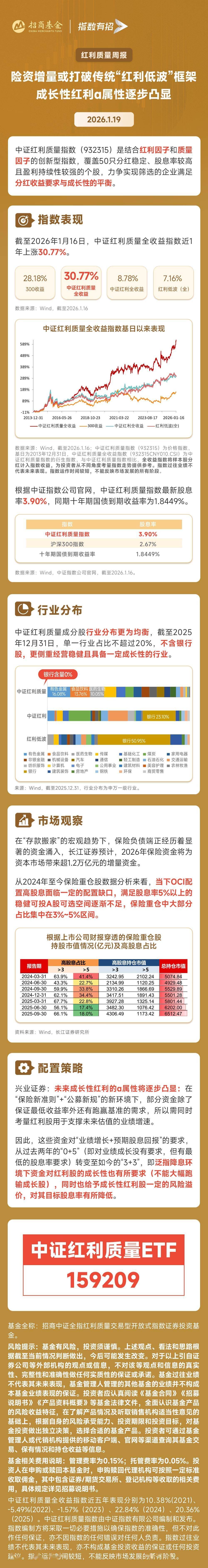 在此背景下,“成长性红利”策略正在受到市场高度关注。中证红利质量ETF(159209)连续7日获资金净流入超1.2亿元。其跟踪的中证红利质量指数(932315)是结合红利因子和质量因子的创新型指数,覆盖50只分红稳定、股息率较高且盈利持续性较强的个股,截至2025年12月31日,前三大行业分别为有色金属、食品饮料、医药生物,单一行业占比不超过20%,不含银行股,更侧重经营稳健且具备一定成长性的行业。
