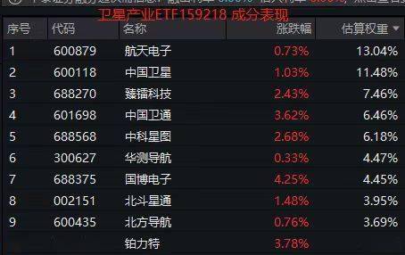 1月29日早盘,卫星产业延续近期强势,表征板块的两融标的卫星产业ETF(159218)上攻1.58%。前十大权重股全线飘红,其中中国卫通领涨,涨幅达3.59%,中科星图、臻镭科技分别上涨2.65%和2.67%,中国卫星、航天电子等亦稳健上扬。
