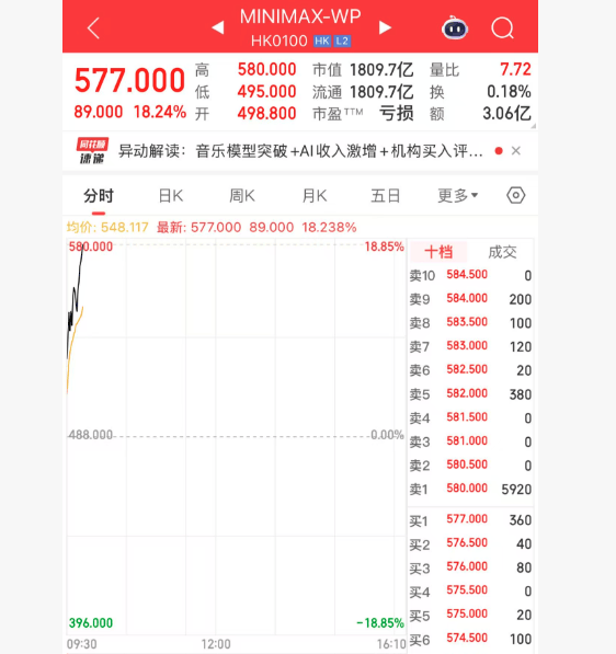 上证报中国证券网讯(记者 李五强)1月29日,MINIMAX-WP开盘后快速拉升,截至9时46分,报577港元/股,上涨18.24%,最新市值超过1800亿港元。