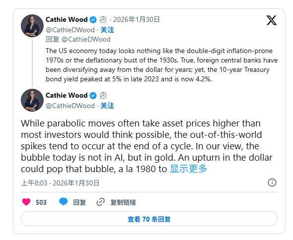 而就在1月30日、金价暴跌12%至5000美元以下,创下自20世纪80年代初以来最大单日跌幅的几个小时前,华尔街明星基金经理、方舟投资的掌门人凯茜•伍德(Cathie Wood)在社交媒体X上发帖暗示,金价接近峰值的可能性正在上升。