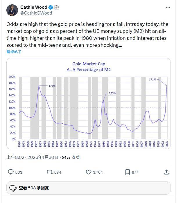 伍德认为,黄金近期的上涨并非经济稳定的体现,而是周期末期典型的“抛物线式波动”。她指出,黄金市值占美国货币供应量(M2)的比例已达到大萧条以来的最高水平,而这是一个重要的预警信号。