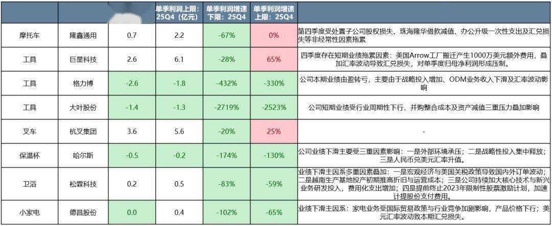 反转策略③:偏左侧视角,哪些行业仍承压,但财报可看到部分需求侧改善的迹象?主要是对美制造业出口链。从已披露公司看,出口链Q4业绩大概率有压力,源于汇率升值、关税、需求等。向前看,当前美国制造业建造支出在历史底部,而工业机械订单已持续改善。