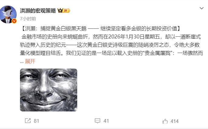 洪灏再度发文,继续坚定看多金银的长期投资价值。而且在1月30日上午黄金巨震之际,洪灏声称:白银模型更新,短期交易性调整窗口打开,波动加剧。只是不知,在黄金暴跌之际的提示,这种意义到底有多大?