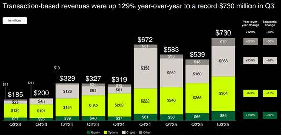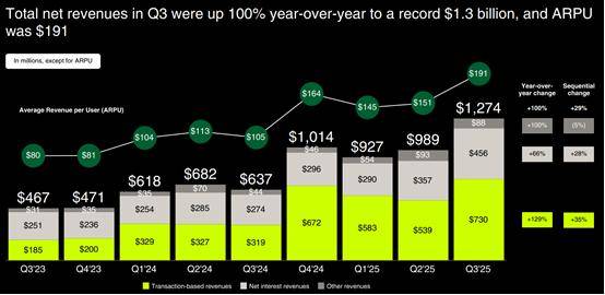 营收翻倍:公司Q3单季净营收达到12.7亿美元,同比增长100% 。这一增速不仅远超华尔街预期,更让同行(如嘉信理财、盈透证券)的个位数或低双位数增长相形见绌。