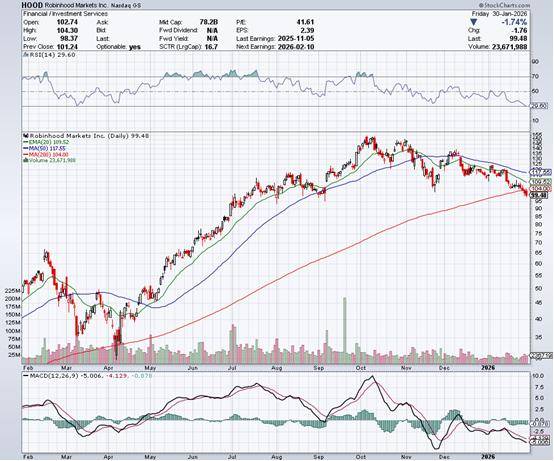 在过去一年里,HOOD股价飙升超过101%,实现翻倍增长。虽然2026年初至今回调了12.04%,但这恰恰为投资者提供了一个难得的买入机会。当前市值约895亿美元,公司正站在一个全新的发展阶段:第三季度营收翻倍增长、预测市场业务爆发式增长、Gold会员数突破280万、以及潜在成为"特朗普儿童账户"托管机构的历史性机遇。