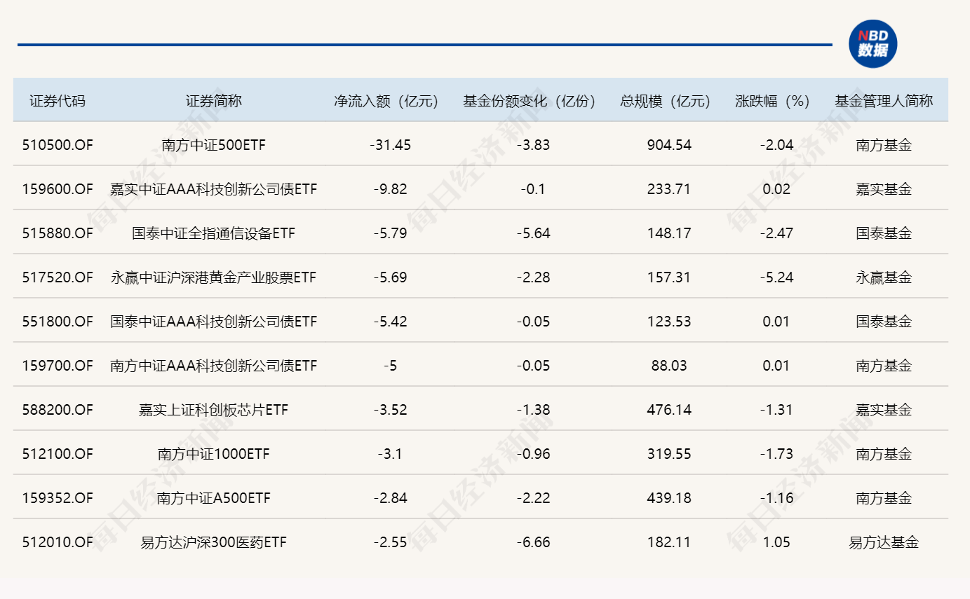 与此同时,南方中证500ETF基金份额减少5.56亿份,净流出额25.97亿元;嘉实中证AAA科技创新公司债ETF基金份额减少2.00亿份,净流出额16.62亿元;国泰中证全指通信设备ETF基金份额减少4.68亿份,净流出额15.71亿元。