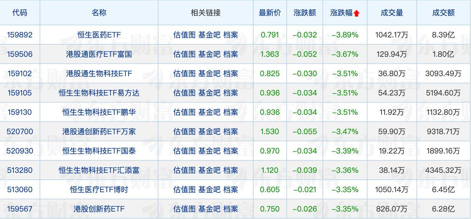 下跌方面,港股医药相关ETF回调居前,最大跌幅为3.89%。