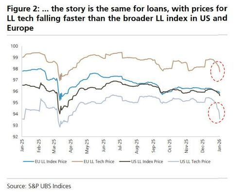此外,科技行业的杠杆贷款市场同样表现疲软,跌幅超过了美国和欧洲更广泛的杠杆贷款指数。近期信用债市场的一系列事件,如英国抵押贷款公司Market Financial Solutions的倒闭,以及此前First Brands Group和Tricolor Holdings的破产,进一步加剧了市场对信用债承销标准宽松的担忧,引发了对资产被重新抵押的猜测。