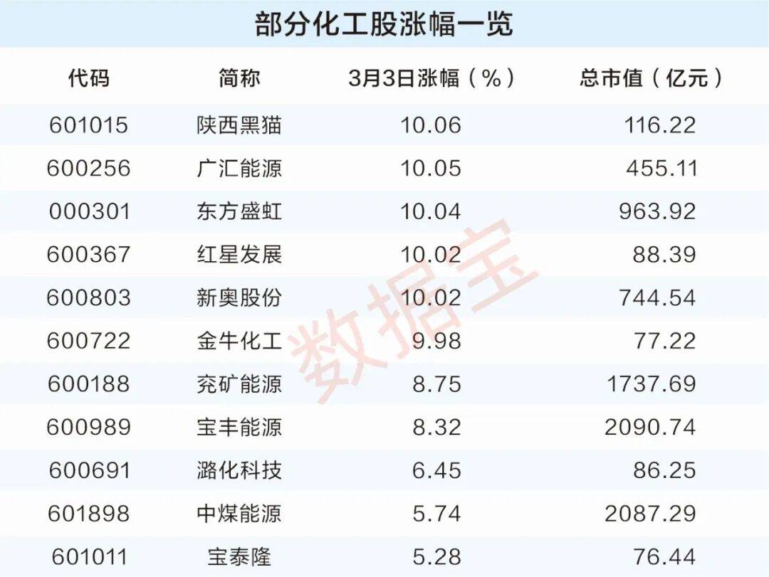 3月3日,相关化工股市场表现强势,平均涨幅达到2.13%,陕西黑猫、广汇能源、东方盛虹等多股涨停,兖矿能源和宝丰能源等涨幅均超过8%。
