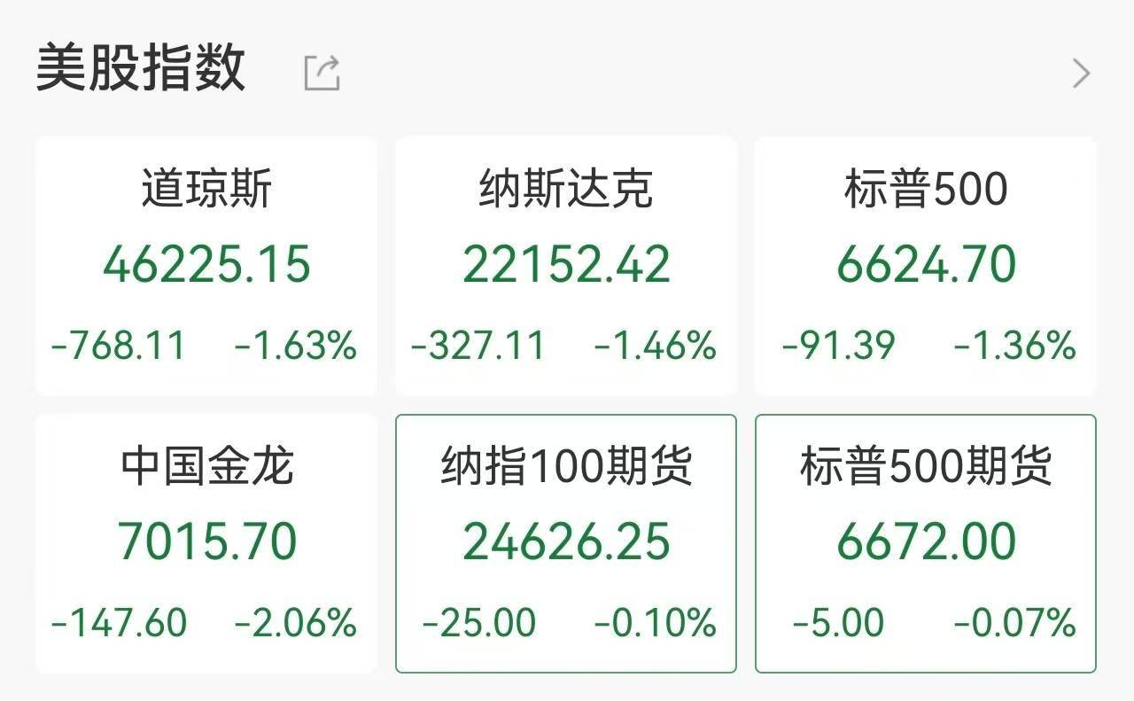 美联储的“鹰派”信号与中东紧张局势叠加,触发全球风险资产抛售。美股三大指数全线收跌,道指跌1.63%至46225.15点,标普500指数跌1.36%,纳指跌1.46%,均创下去年11月以来新低。大型科技股集体下挫,亚马逊跌超2%,微软、特斯拉、苹果等跌幅均逾1%。