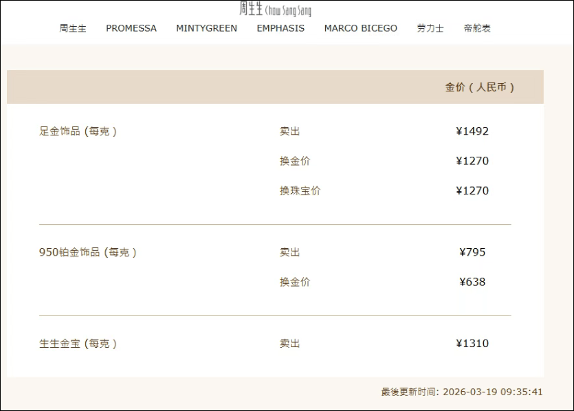 周生生金饰克价1492元,较前一日1547元/克的价格 下跌55元/克,相比3月3日的月内高点1650元/克跌158元。