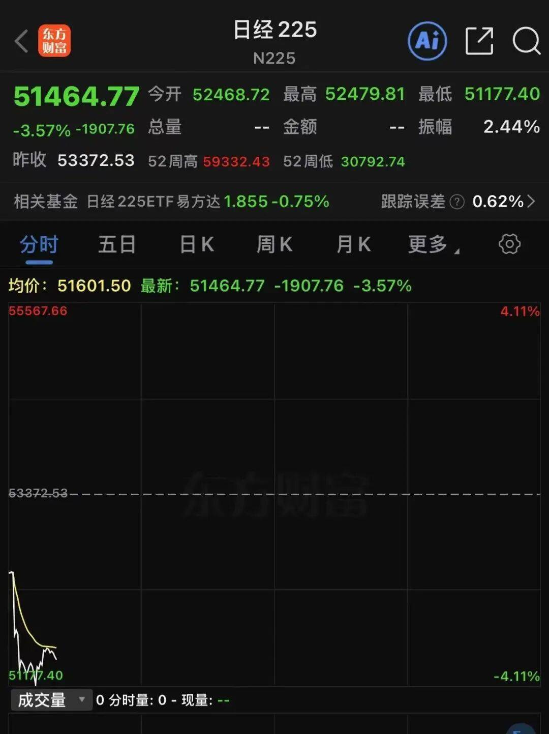 截至发稿,日经225指数重挫近2000点,日内跌超3%。