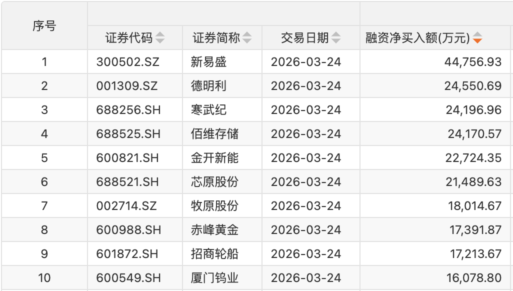 个股方面,21只个股获融资净买入额超1亿元。新易盛获融资净买入额居首,净买入4.48亿元;融资净买入金额居前的还有德明利、寒武纪、佰维存储、金开新能、芯原股份、牧原股份、赤峰黄金、招商轮船、厦门钨业等。