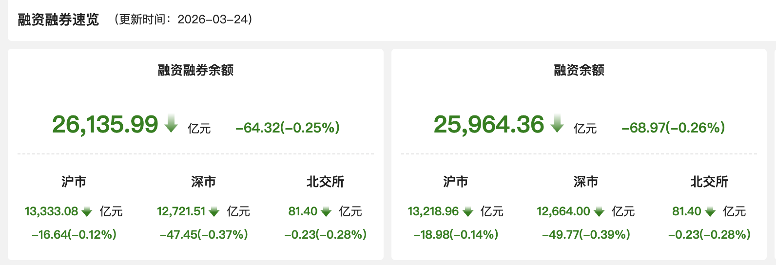 3月24日,A股两融余额为26135.99亿元,较上一交易日减少64.32亿元,占A股流通市值比例为2.67%。当日两融交易额为1813.35亿元,较上一交易日减少298.47亿元,占A股成交额的8.65%。