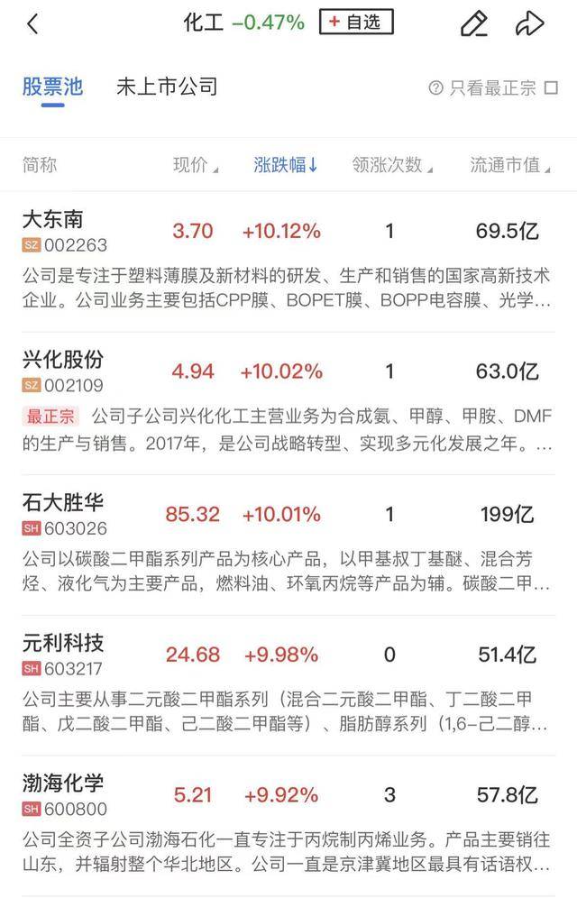 化工股局部反弹,大东南、兴化股份、佛塑科技、元利科技、渤海化学涨停,松井股份、国泰集团、嘉亨家化等涨幅居前。
